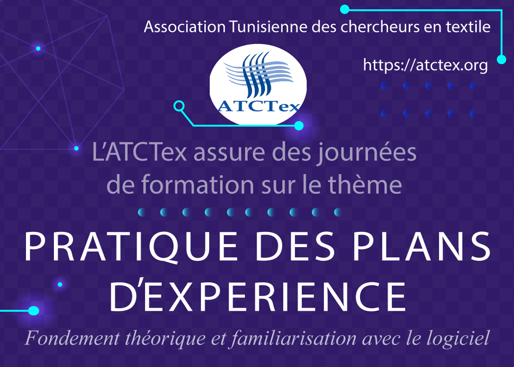 L'ATCTex organise des journées de formation sur la pratique des plans d'expérience: Fondement théorique et familiarisation avec le logiciel et ceci le 02, 03 et 04 mai 2024 à l'ISET Ksar Hellal