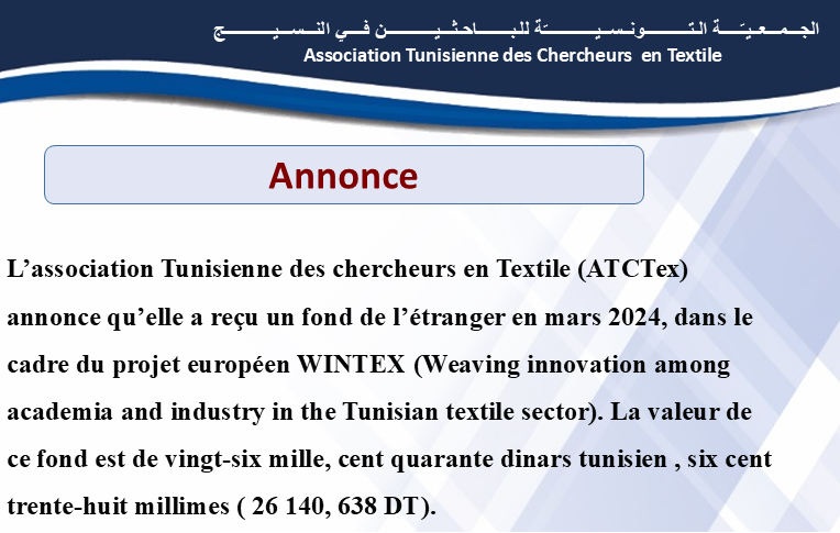 Annonce l'ATCTex a reçu un fond de l’étranger dans le cadre du projet WINTEX